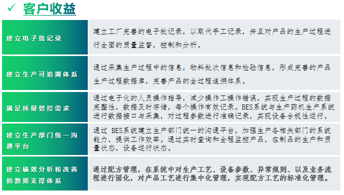 BES實(shí)施內(nèi)容:處方管理/生產(chǎn)管理/物料管理/稱重配料/生產(chǎn)執(zhí)行/質(zhì)量管理/設(shè)備管理/電子批記錄 |