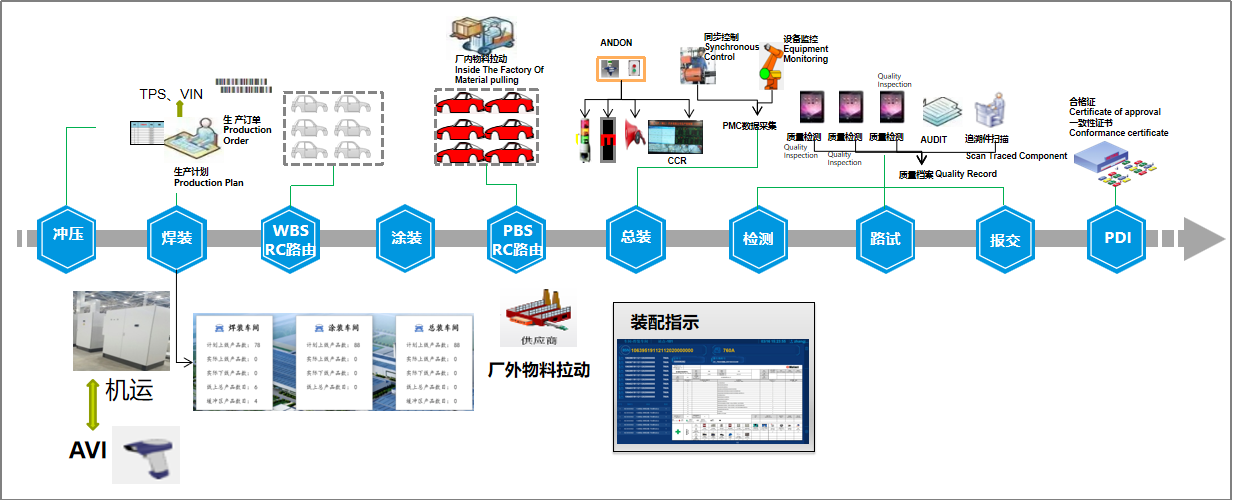 項目業(yè)務(wù)范圍覆蓋生產(chǎn)計劃管理、生產(chǎn)過程管理、過程質(zhì)量管理等生產(chǎn)核心業(yè)務(wù)。MES系統(tǒng)功能范圍包括:計劃管理、AVI車輛設(shè)備跟蹤、質(zhì)量管理、Andon管理、PMC監(jiān)控、RC路由控制、設(shè)備管理、報表管理、接口管理等