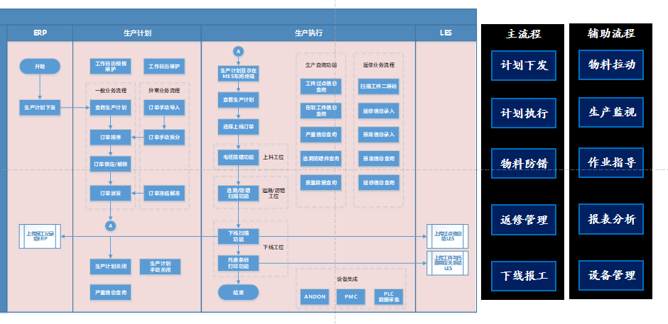 MES項目的涉及的功能模塊包含:系統(tǒng)管理、制造執(zhí)行(機加車間)、制造執(zhí)行(裝配與檢測車間)、質量管理、生產(chǎn)監(jiān)控、報表管理、系統(tǒng)接口、設備集成調試、ANDON、PMC