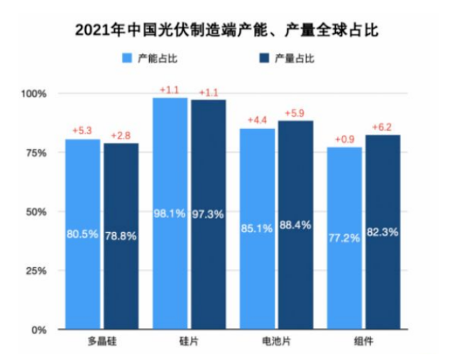 根據(jù)國際能源署2022年7月發(fā)布的《光伏全球供應(yīng)鏈》特別報告,2021年中國生產(chǎn)能力在全球占比中,多晶硅占80.5%,硅片占98.1%,電池占85.1%,光伏組件占77.2%。
