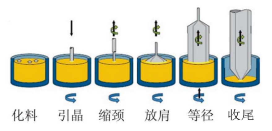 將硅料投入坩堝,化料,拉晶,拉出晶硅毛棒