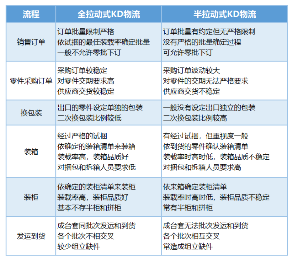 下面,漢思從KD物流的各個環(huán)節(jié),來對比分析全拉動式KD物流和半拉動式KD物流的區(qū)別,對比詳如下表: