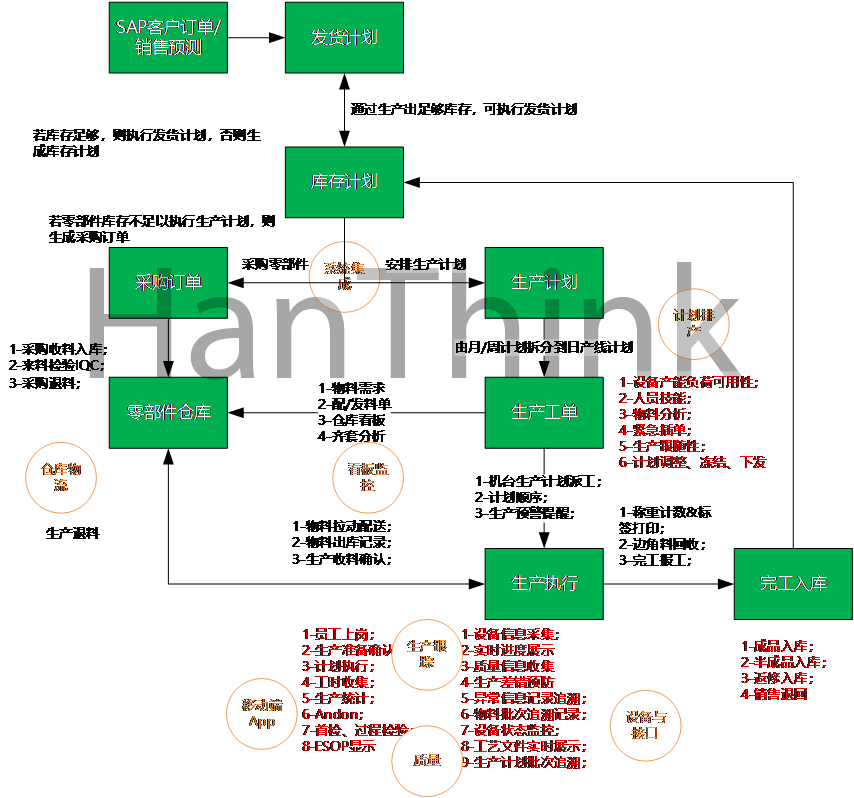 管理計劃(成品發(fā)貨計劃、生產(chǎn)計劃/外協(xié)計劃)一般來自于ERP,在MES內(nèi)拆分為多車間、工序的生產(chǎn)計劃。由發(fā)貨計劃倒推得到制造計劃(成品庫存不足時需通過制造得到成品),制造計劃根據(jù)BOM用量展開所需物料后,對比已有庫存計算得到物料采購計劃,執(zhí)行物料采購計劃得到足夠的原料,用于成品制造計劃執(zhí)行過程中的消耗,而成品制造計劃完成后得到成品,用于發(fā)貨計劃使用。各計劃相互關(guān)聯(lián),分別指導(dǎo)不同階段的操作,執(zhí)行過程中物料的增、減、轉(zhuǎn)移操作都需要與ERP系統(tǒng)同步,這些物料操作結(jié)合管理上的控制點,就形成系統(tǒng)間接口交互的節(jié)點。
