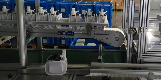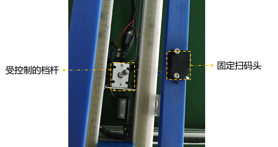 圖中裝置安裝于流水線上,通過簡單的檔桿(白色立柱)與固定掃描頭(黑色)聯(lián)動控制,當(dāng)有離散的產(chǎn)品經(jīng)過時,到位信號觸發(fā)固定掃碼頭讀取產(chǎn)品的條碼序列號,讀取成功則通知受控的檔桿放行,否則檔桿不放行,保證所有經(jīng)過的產(chǎn)品都經(jīng)過了自動掃碼??蹥すば虿捎蒙舷禄蜃笥业膬商自O(shè)計,結(jié)合順序掃碼的特點,即可完成內(nèi)外產(chǎn)品序列碼的綁定。