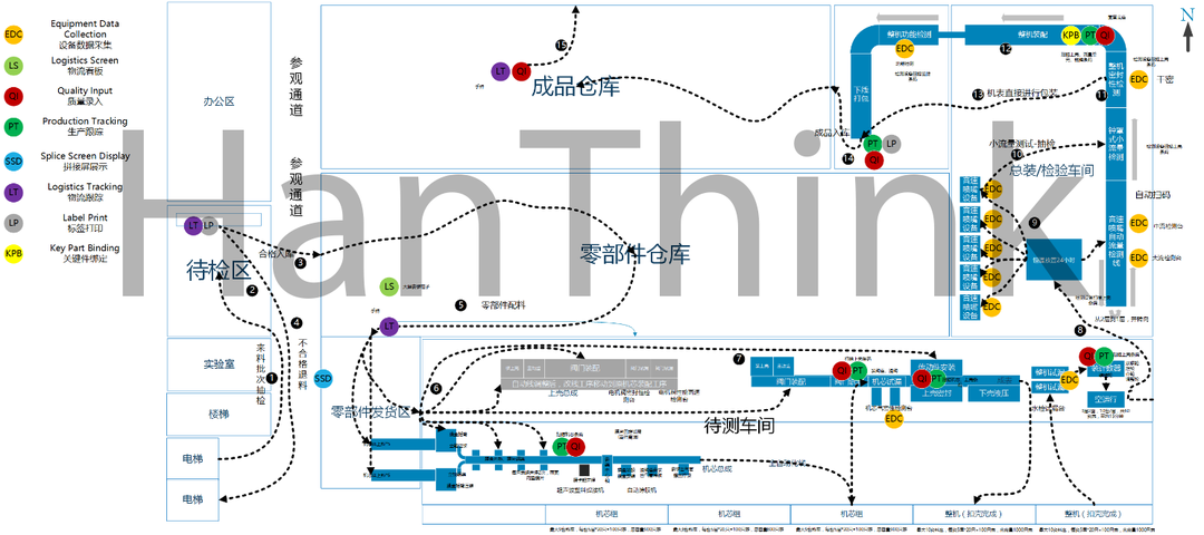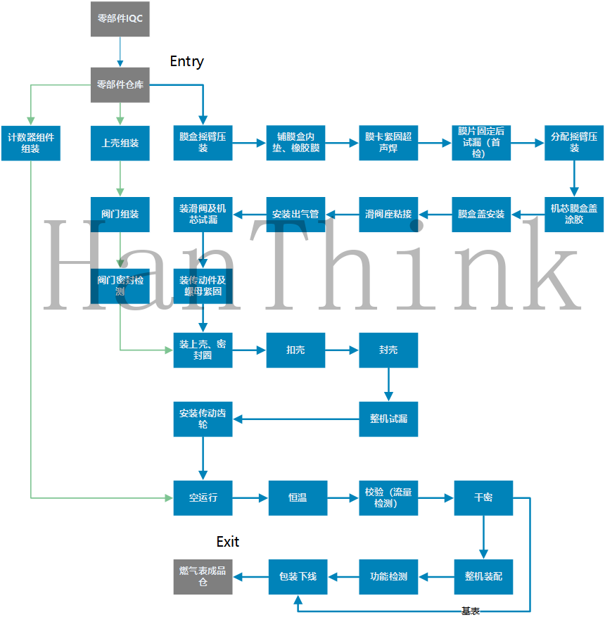 主要分為零部件倉庫、裝配車間(待測車間)、總裝/檢驗車間、成品倉庫,整機大部分組件均在裝配車間完成裝配,總裝/檢驗車間主要進行剩余部分組件裝配和調(diào)試工作,主要針對流量計數(shù)以及芯片功能進行檢測、調(diào)試。
