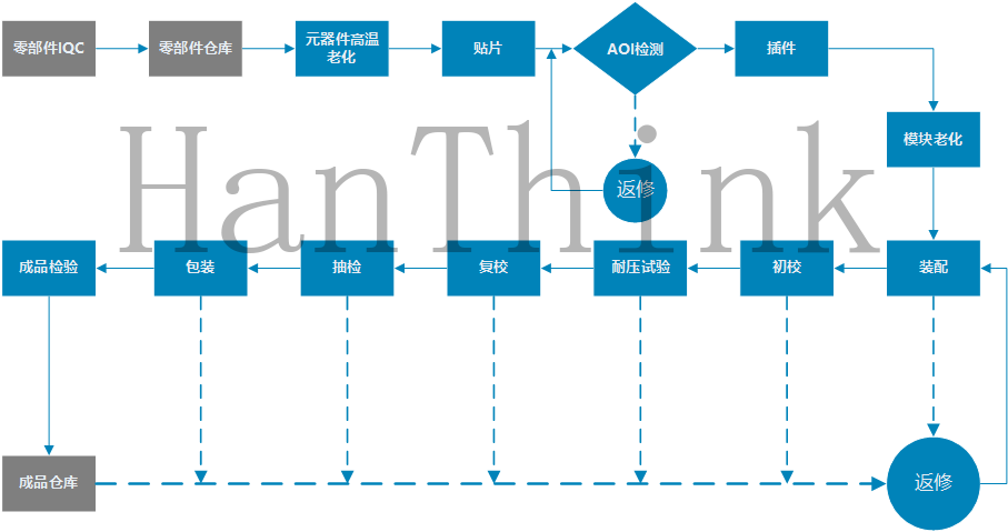 電子表裝配主要經(jīng)過生產(chǎn)領(lǐng)料、SMT、插件補焊、模塊老化、電表裝配、電表檢驗、下線包裝、入庫等主要工序,分為多段車間/生產(chǎn)線生產(chǎn),各段工序按各自工序段計劃進行生產(chǎn)和跟蹤,收集主要部件物料的批次信息,主要集成的檢測設(shè)備包括AOI、耐壓、初校、復(fù)校,建立完善的電表裝配過程數(shù)據(jù)追溯檔案。
