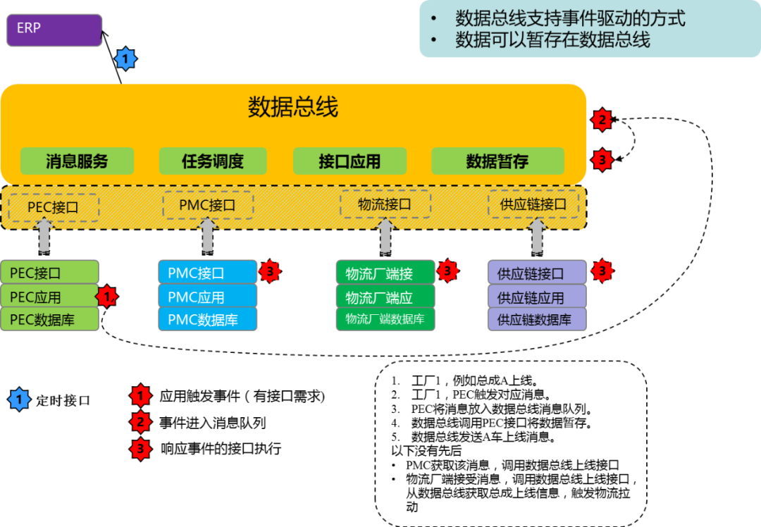 在PEC和PMC之間的數(shù)據(jù)傳輸,采用MQ消息機(jī)制傳輸,確保數(shù)據(jù)傳輸?shù)姆€(wěn)定與高效,一個集團(tuán)PEC可支持與多個工廠的PMC接口通訊,即使是某個工廠的生產(chǎn)模式非常特殊,那么它的PEC系統(tǒng),能獨(dú)立運(yùn)行,基礎(chǔ)數(shù)據(jù)、計(jì)劃等可以用導(dǎo)入方式,例如企業(yè)在國外投資一個組裝工廠,生產(chǎn)計(jì)劃不穩(wěn)定,完全人工制定,產(chǎn)量也不大,那么就只需要部署一個簡易的PEC車間系統(tǒng),不需要和集團(tuán)PMC系統(tǒng)接口。