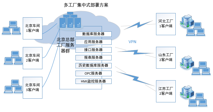 企業(yè)IT一般考慮投資效益,希望一套服務(wù)器能支持多個工廠的應(yīng)用,每個工廠之間用專線或VPN方式連接,這樣的好處是運(yùn)維相對簡單,由集團(tuán)的IT專業(yè)人員對服務(wù)器、數(shù)據(jù)庫、系統(tǒng)做運(yùn)維,能保證系統(tǒng)的穩(wěn)定;