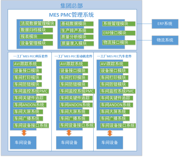 那么怎么解決一些集團(tuán)制造業(yè)提出的MES集團(tuán)化管理需求呢,例如有些企業(yè)的計(jì)劃由總廠制定,物流配送由集團(tuán)統(tǒng)一管理,產(chǎn)品研發(fā)數(shù)據(jù)由一個研發(fā)中心發(fā)布,MES基礎(chǔ)數(shù)據(jù)由總廠維護(hù),生產(chǎn)績效由總廠管理,如果有這些需求,如果是分布式MES部署,那么數(shù)據(jù)接口會非常復(fù)雜,也無法支持集團(tuán)的統(tǒng)一管理。HanThink 推出的SmartWork套件,良好的解決了這個問題,SmartWork把MES功能劃分為PEC(Production Execute Center)車間執(zhí)行層和PMC(Production Management Center) 車間管理層2個模塊,PMC實(shí)現(xiàn)集團(tuán)化部署,PEC實(shí)現(xiàn)分布式部署,與車間設(shè)備直接對接,例如以一個汽車制造集團(tuán)為例,MES的PEC和PMC功能劃分如下: