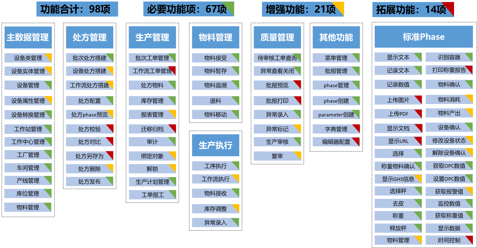 Hi Pharma行業(yè)套件包含功能98項,其中必要功能67項,增強功能21項,拓展功能14項,覆蓋模塊包含:主數(shù)據(jù)管理、處方管理、生產(chǎn)管理、物料管理、質(zhì)量管理、生產(chǎn)執(zhí)行、標準Phase及其他功能模塊。