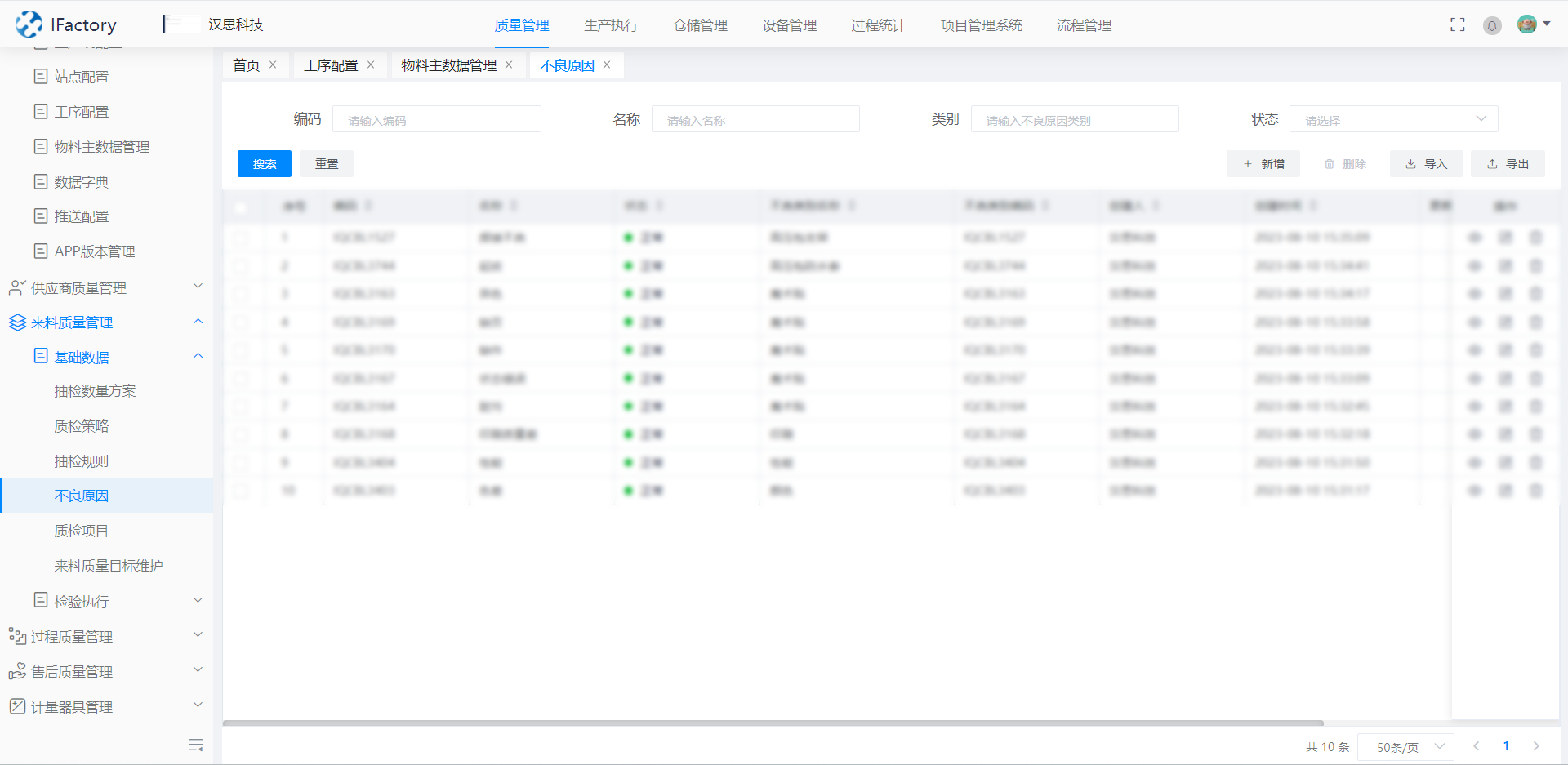 4、在來料質(zhì)量管理、過程質(zhì)量管理和成品質(zhì)量管理模塊中均會涉及到的大量的質(zhì)檢項目、不良原因、質(zhì)檢規(guī)則(如來料質(zhì)量管理的質(zhì)檢策略、抽檢規(guī)則;過程質(zhì)量管理的質(zhì)檢路線等)