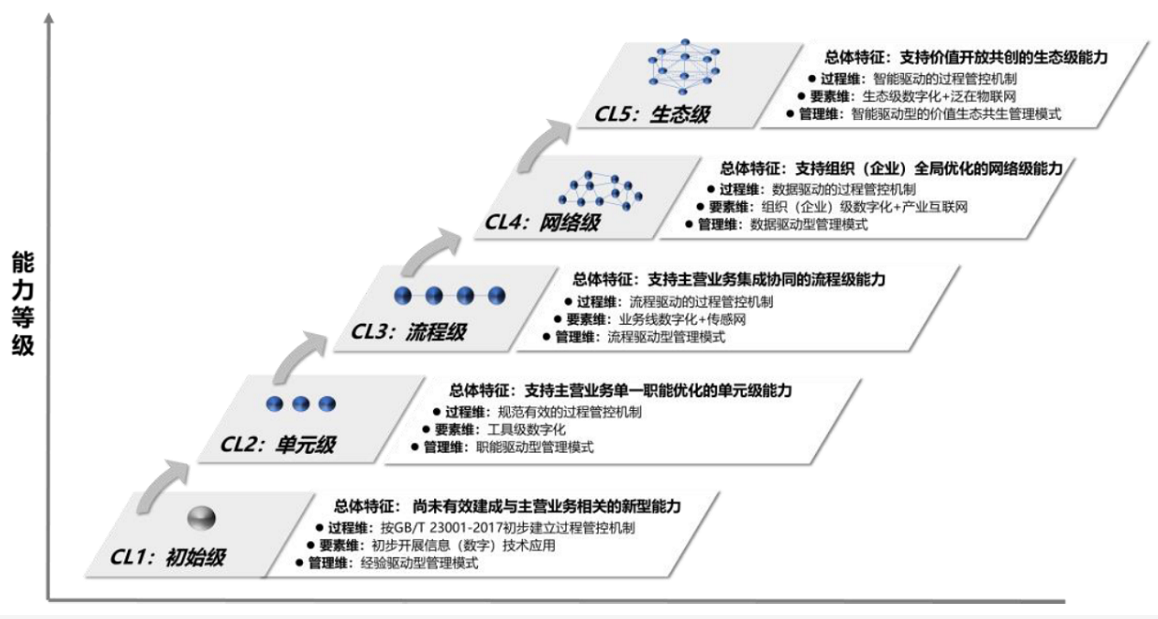 數(shù)字化轉(zhuǎn)型五個(gè)發(fā)展階段,低到高劃分為 CL1(初始級(jí) )、CL2(單元級(jí) )、CL3(流程級(jí))、CL4(網(wǎng)絡(luò)級(jí))和 CL5(生態(tài)級(jí))等五個(gè)等級(jí),不同等級(jí)能力呈現(xiàn)不同的狀態(tài)特征以及能力單元/能力模塊的過(guò)程維、要素維、管理維的不同建設(shè)重點(diǎn) 。