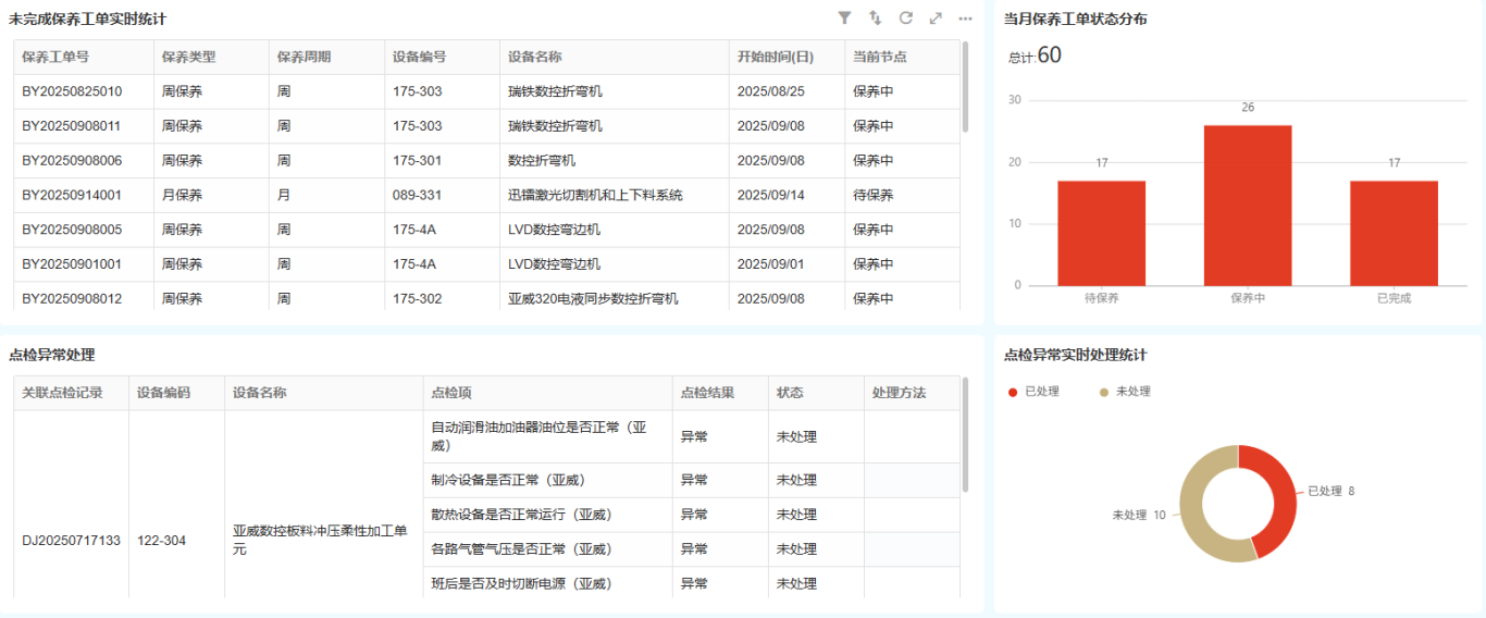 核心能力:設(shè)備臺(tái)賬數(shù)字化→點(diǎn)檢 / 巡檢 / 保養(yǎng)工單自動(dòng)下發(fā)→設(shè)備數(shù)據(jù)實(shí)時(shí)采集(故障代碼 / 啟停記錄)→預(yù)警與維修閉環(huán);