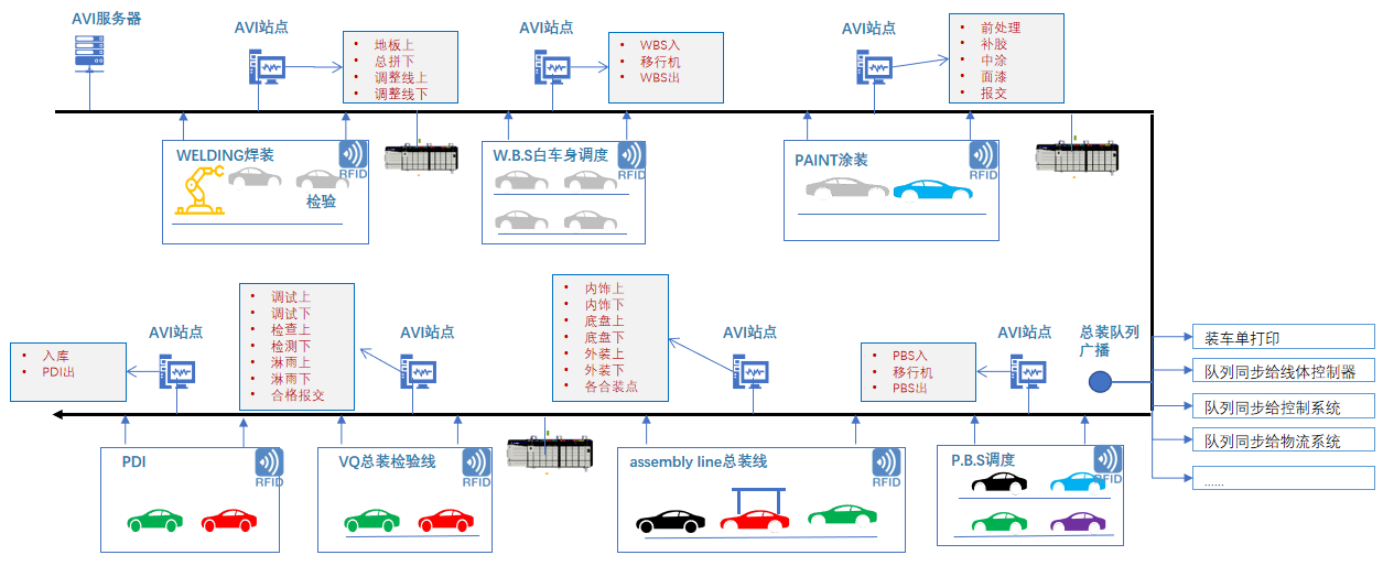AVI管理:AVI系統(tǒng)功能: Automatic Vehicle ldentifcation,系統(tǒng)通過條形碼 (焊裝車間、涂裝車間、總裝車間) 信息載體實現對車輛的跟蹤及識別,并將這些生產現場所獲信息及時反饋到相關系統(tǒng)信息載體可以用條形碼或RFID標簽,在車身及總裝車間一般使用條碼進行生產跟蹤,涂裝車間、WBS及PBS區(qū)域工作環(huán)境惡劣,一般采用RFID進行自動采集。AVI系統(tǒng)根據這些信息完成對車體的跟蹤,并將這些信息傳送給輸送鏈系統(tǒng)和相關過程設備相關設備根據條碼進行工藝選擇、防錯等功能,同時這些數據被歸檔在數據庫中進行數據分析,生成各種生產報告。
