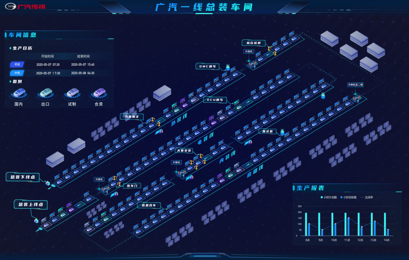 生產管理:汽車整車行業(yè)的生產管理,包括生產過程監(jiān)控和生產過程數據采集,監(jiān)控生產過程,自動糾正生產中的錯誤,并向用戶提供決策支持,以提高生產效率。過程管理還應包括報警功能。通過對過程進行相應的數據采集,收集來自人員,機器、設備、操作、工序,物料等方面的現場數據,形成過程當前的狀況信息,以便其它相關系統(tǒng)和人員進一步使用。實現四大工藝車間節(jié)拍信息及產量信息、車身運行及時率信息及跟蹤信息、車間運行效率及滯留車管理,對關鍵制造工序的防錯及追溯管理等功能。
