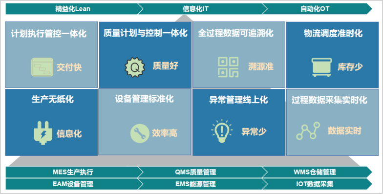 數(shù)字化轉(zhuǎn)型應(yīng)始終圍繞“精益化”、“信息化”、“自動化”的三化融合理念,思考如何為企業(yè)QCD帶來價值提升?;谧陨淼墓芾硖攸c、痛點、需求點,逐步引入MES、QMS、WMS、EAM、數(shù)采等工廠管理軟件,來覆蓋生產(chǎn)所需要的人、機、料、環(huán)、法、測等各個管理要素,幫助企業(yè)解決相關(guān)的管理痛點,提升QCD。