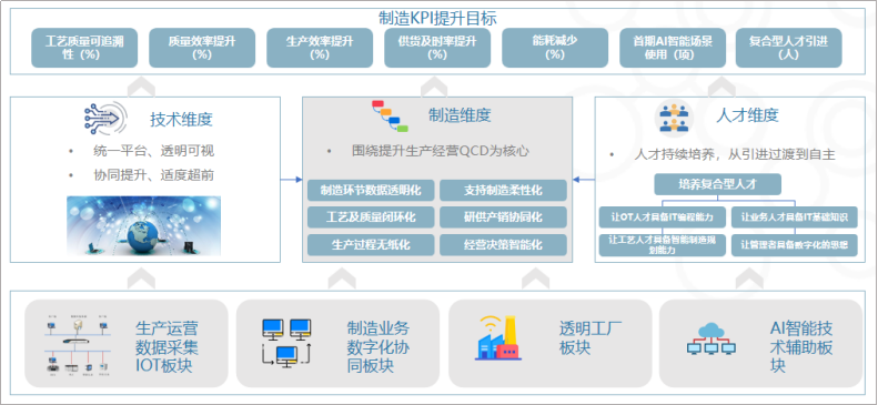 智能制造應(yīng)一切圍繞提升生產(chǎn)經(jīng)營QCD為核心目的,通過培育智能制造人才梯隊,搭建智能工廠數(shù)字化平臺,實現(xiàn)統(tǒng)一采集制造數(shù)據(jù)及分析、具備協(xié)同制造各單位業(yè)務(wù)、實現(xiàn)工廠透明運營、并逐步引入AI智能手段輔助生產(chǎn)運營。