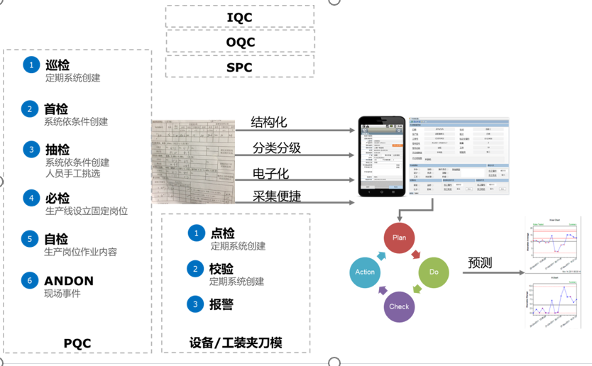 全面質(zhì)量管理:從原料、部件(零配件)來料質(zhì)檢、到開始生產(chǎn)的首檢、以及生產(chǎn)過程的巡檢、抽檢、自檢和必檢階段實現(xiàn)全生命周期的質(zhì)量管控,所有檢驗過程都可以實現(xiàn)移動端自動錄入和檢驗設(shè)備實時數(shù)據(jù)收集,實現(xiàn)質(zhì)量數(shù)據(jù)過程分析,及時預(yù)警發(fā)現(xiàn)質(zhì)量問題并能夠閉環(huán)處理。