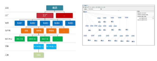 • 工廠模型支持ISA-95工廠建模,提供圖形化界面配置企業(yè)→工廠→車間→生產(chǎn)線→加工中心→設(shè)備→工具的資源模型層級(jí)