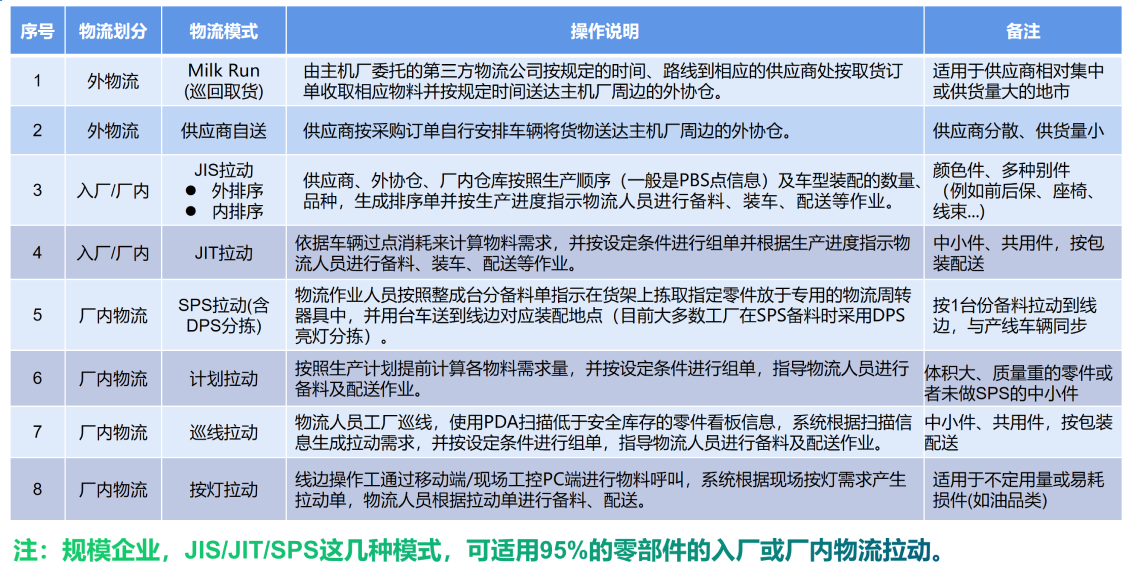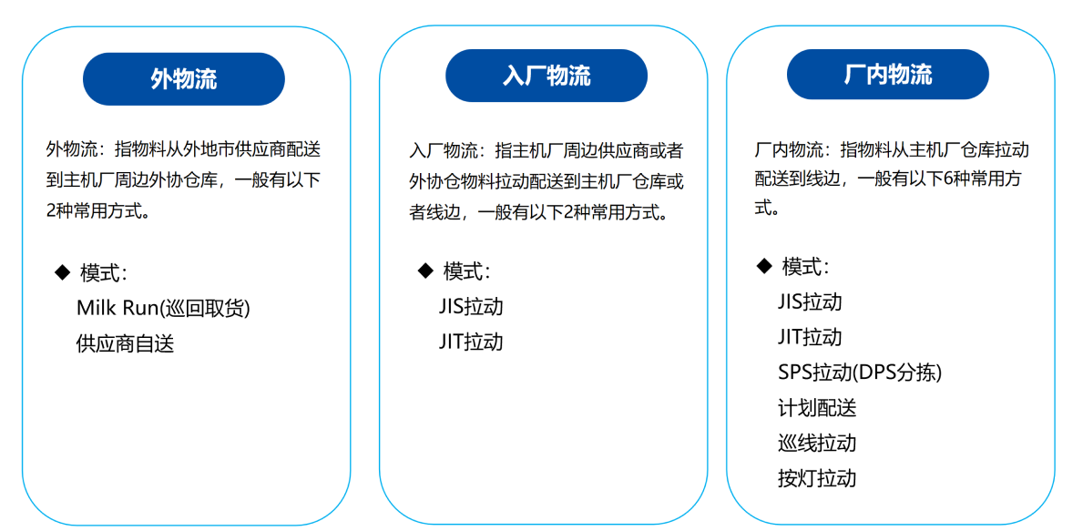 • 入廠物流:主機廠周邊供應(yīng)商/外協(xié)倉物料配送到主機廠生產(chǎn)線或廠內(nèi)倉庫