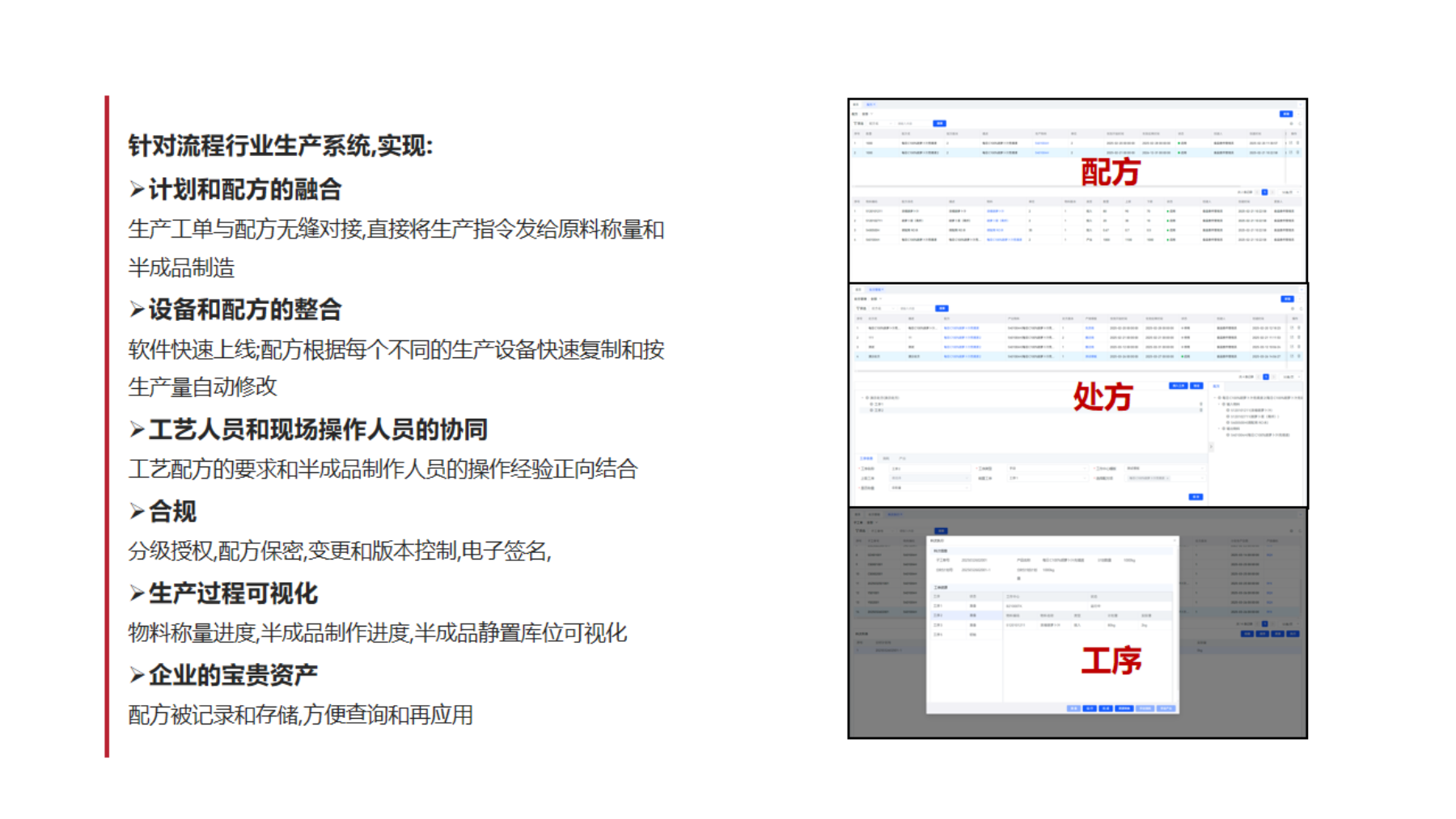生產(chǎn)工單與配方無縫對接,直接將生產(chǎn)指令發(fā)給原料稱量和半成品制造 軟件快速上線;配方根據(jù)每個不同的生產(chǎn)設(shè)備快速復(fù)制和按生產(chǎn)量自動修改 工藝人員和現(xiàn)場操作人員的協(xié)同,生產(chǎn)過程可視化 分級授權(quán),配方保密,變更和版本控制,電子簽名 物料稱量進度,半成品制作進度,半成品靜置庫位可視化