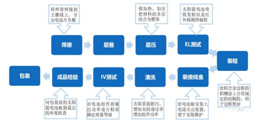 光伏組件的生產(chǎn)屬于典型的離散行業(yè)組立的過程,其生產(chǎn)過程主要包括如下流程,硅片焊接通常采用銀漿或其他導(dǎo)電材料進(jìn)行電池片的連接。焊接好的電池片需要進(jìn)行組裝,通常采用EVA膠或其他粘合劑將電池片與玻璃、背板等材料進(jìn)行組裝,形成完整的光伏組件。組裝好的光伏組件需要進(jìn)行測試,包括輸出功率、IV曲線、溫度特性等方面的測試,最后,經(jīng)過測試的光伏組件需要進(jìn)行包裝,通常采用木箱、泡沫板等材料進(jìn)行包裝。