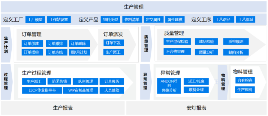 通過事前的生產(chǎn)流程設(shè)計(jì)以及BOM設(shè)計(jì),控制生產(chǎn)工單的執(zhí)行并通過實(shí)時(shí)記錄,異常處理和生產(chǎn)報(bào)表,對車間生產(chǎn)過程進(jìn)行全流程管理與監(jiān)控。