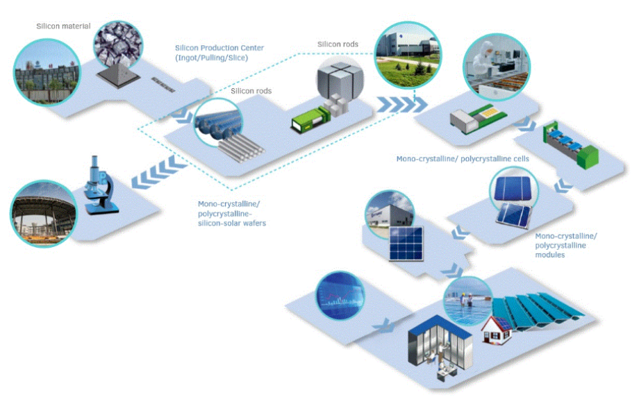 光伏產(chǎn)業(yè)以硅為主線,上中下游包括硅料、硅片、 電池、組件、電站等23個(gè)環(huán)節(jié)。光伏行業(yè)既包含了流程行業(yè)的工藝(投料,拉晶等),也包含了離散行業(yè)的工藝(對毛棒的機(jī)加、光伏組件的組立等),是典型的混合型行業(yè)。 光伏的上游產(chǎn)業(yè)鏈指的是光伏原材料加工制成硅片,生產(chǎn)工藝流程分為多晶硅提煉、鑄錠/拉棒、切片、表面制絨及酸洗、擴(kuò)散制結(jié)、等離子刻蝕及酸洗、鍍減反射膜、絲網(wǎng)印刷、快速燒結(jié)等。涉及的材料包括金屬硅、多晶硅、硅片、銀漿等。 中游為電池片及組件合成,光伏組件由太陽能電池片組合在一起構(gòu)成。他們封裝在一個(gè)不銹鋼、鋁或其他非金屬邊框上,安裝好上面的玻璃及背面的背板、充入氮?dú)狻⒚芊?。整體稱為組件,也就是光伏組件或說是太陽電池組件。 下游為光伏電站運(yùn)營。光伏電站,是指一種利用太陽光能、采用特殊材料諸如晶硅板、逆變器等電子元件組成的發(fā)電體系,與電網(wǎng)相連并向電網(wǎng)輸送電力的光伏發(fā)電系統(tǒng)。