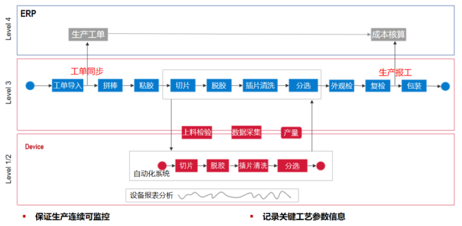 對生產(chǎn)加工設(shè)備參數(shù)進(jìn)行實(shí)時(shí)自動(dòng)采集、監(jiān)視,處理,存儲(chǔ),利用和管理。與切片設(shè)備、脫膠設(shè)備、插片清洗和分選設(shè)備無縫集成。人員操作信息,投料記錄等生產(chǎn)信息自動(dòng)采集。